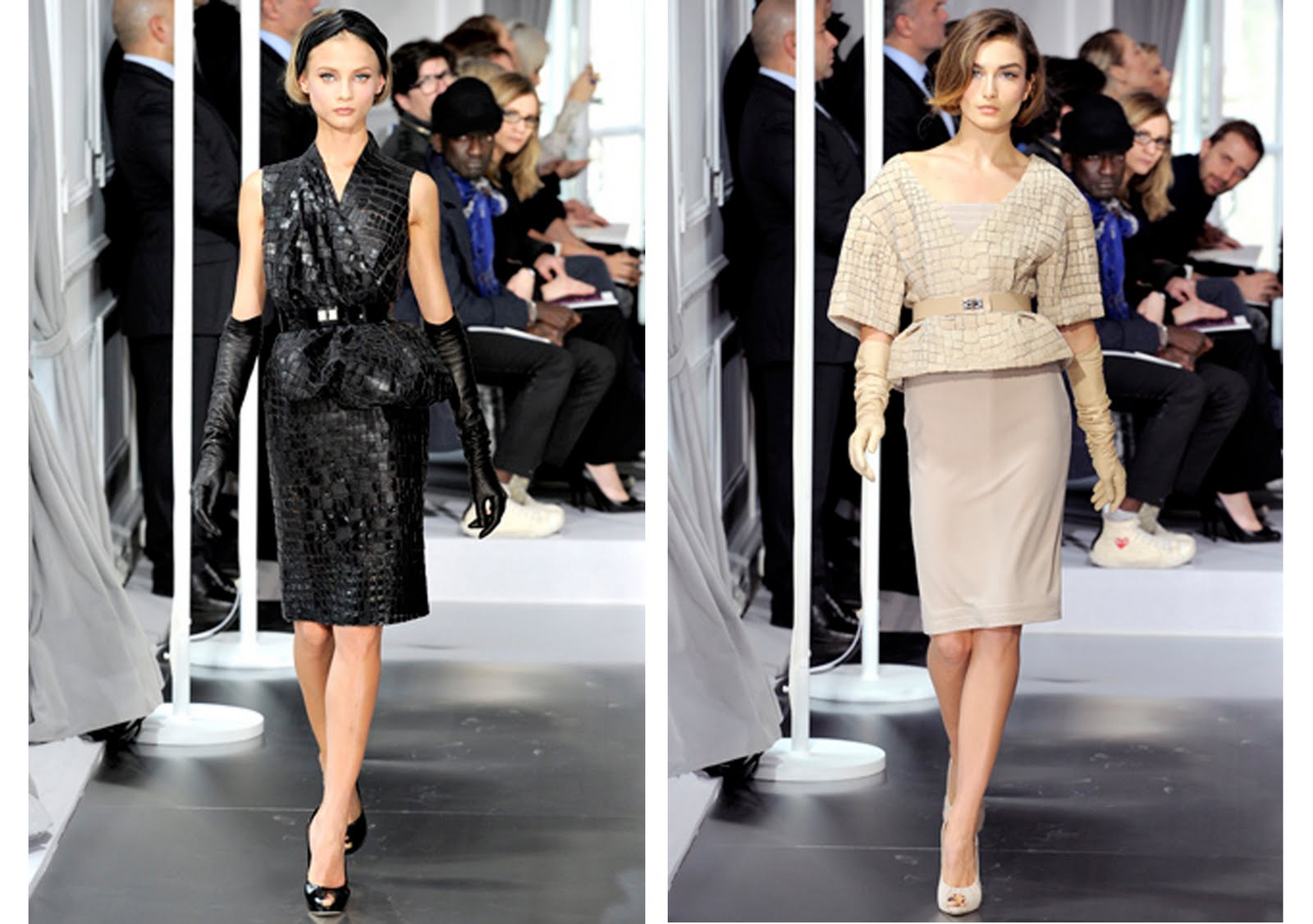 A lépcső és a tizenakáhánycentis magassarkú nem túl könnyed párosítás. Még a sokat próbált szupermodellek arcáról is süt az az érzés, amit én azt hiszem a diplomaosztón éreztem, mikor több száz ember előtt hosszú és fura talárban és magassarkúban közeledsz az ingatag emelvényhez és csak arra gondolsz: csak most ne essek el! Nos a Dior bemutatón is valahogy ezt éreztem és ezt csak fokozta a görcsös kapaszkodás a korlátba vagy épp a falba. Nem túl elegáns. Azért a sík terepen már kárpótoltak a ruhák.